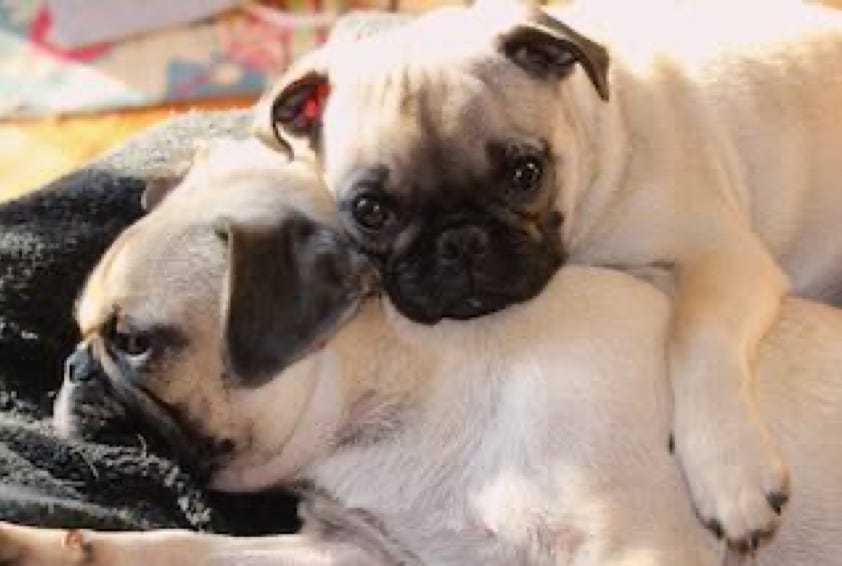 We ask a lot of our animals, projecting onto them our best, or sometimes worst, attributes; using them as mirrors or therapists. I’m not the first to suggest that perhaps what we most love about our cats and dogs is what we most wish for ourselves. We always had dogs, by ‘we’ I mean Vivian and I; almost as soon as we got together we had a dog, bought as an ill-judged present for someone who didn’t want him. And so, naturally, after spending the night with us we weren’t about to return him to the breeder; we kept him and he became the first of our joint responsibilities. In time I bought a companion for him and they both came with us when we emigrated to the US, red miniature wire-haired dachshunds. We’d go on to have more dachshunds, standards, wild-boar colored, bold, noisy, and ardent—those are dogs you might well call merry. Plus there were rescues and one lovely, gentle boxer, bringing our total pack up to five for a time. After Vivian’s death, I was left with the boxer and two pugs. I briefly took in another dog left behind by an acquaintance, but he died after he’d been with me only a few months. Then the boxer succumbed to a genetic condition that was only discovered in the last few weeks of her life. Not a good time for mortalities, but at least I had the pugs.