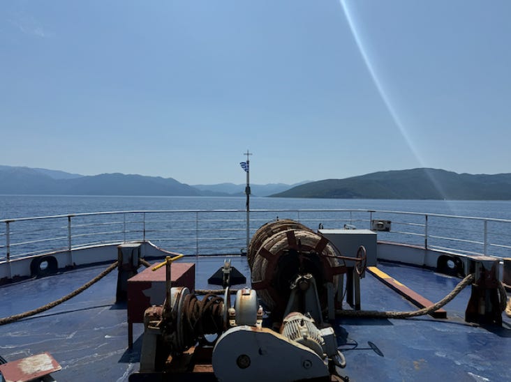 And in an hour or so, there was the ferry. I had my ticket to show the guy on the dock. He put me in line to load early as we were coming off last, and then the car was loaded and I was free to go up on deck to watch us leave, to watch us sail out, to look at the smaller islands passing, to wait for Ithaca, to chart our course on my phone’s GPS (fun to do and it stops you from wondering Do I Get Off Here as land approaches when you can see this isn’t your port and there’s a way still to go), and see Ithaca up ahead, be sure that’s the island, watch as we make the final approach, get back into the car, drive out in turn, and be there on the dock in the bright sunlight to follow a short line of cars heading up a steep road to the corniche that winds around the island for Vathy, where I would be staying.