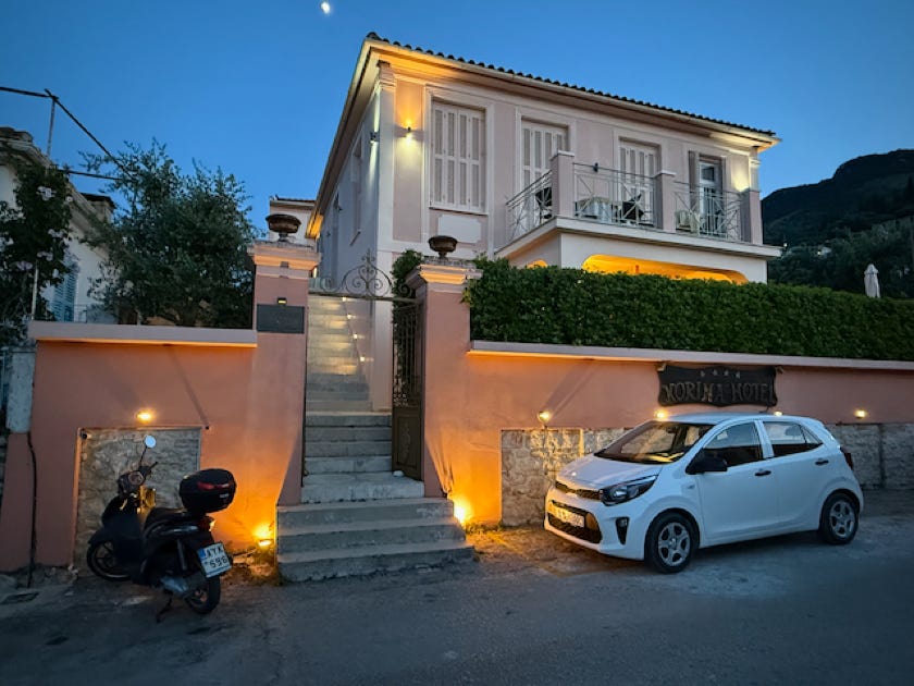 Intimate, elegant, for my time on Ithaca I stayed in that hotel. not expensive, with a wonderfully engaging proprietor, perfectly placed, in a room with a balcony overlooking tile roofs and the harbor. Instead of luxury it offers comfort, thoughtfulness and peace—plus a few quirks, though minus a film crew. My travel agent had been reluctant to commit to it, unconvinced it would meet his standards, but it set the scene perfectly for my few days on the island, let me rest, park on the street and not worry, and try to figure out why I was there.