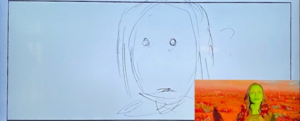 “This was a scene that I storyboarded before I ever wrote,” director/writer James Gunn tells us displaying the very basic comic-style drawings he made of the sequence. “So these storyboards that you see of mine… are sort of my emoji drawings… were the very first thing that was created about this scene. It’s completely visually oriented.” We see an intermediate computerized version based on his cartoons, followed by the scene as it appears in the movie: the workflow. What’s striking is the way that Zoe Saldana’s facial expressions so closely match Gunn’s cartoons, her eyes opened wide in close-up, her mouth a cinematic O of apprehension. The camera isn’t so much recording an inward human reaction as an outward projection, in Gunn’s words an emoji, the language of facial recognition software that, whether accurate or not, signals a recognizable shortcut, a flash-card to inform the audience what’s going on when explanations would slow the action. All of which made me think of how we represent ourselves to the world, how we read the representations of others, the acting teacher Sanford Meisner, and the Socratic Problem.